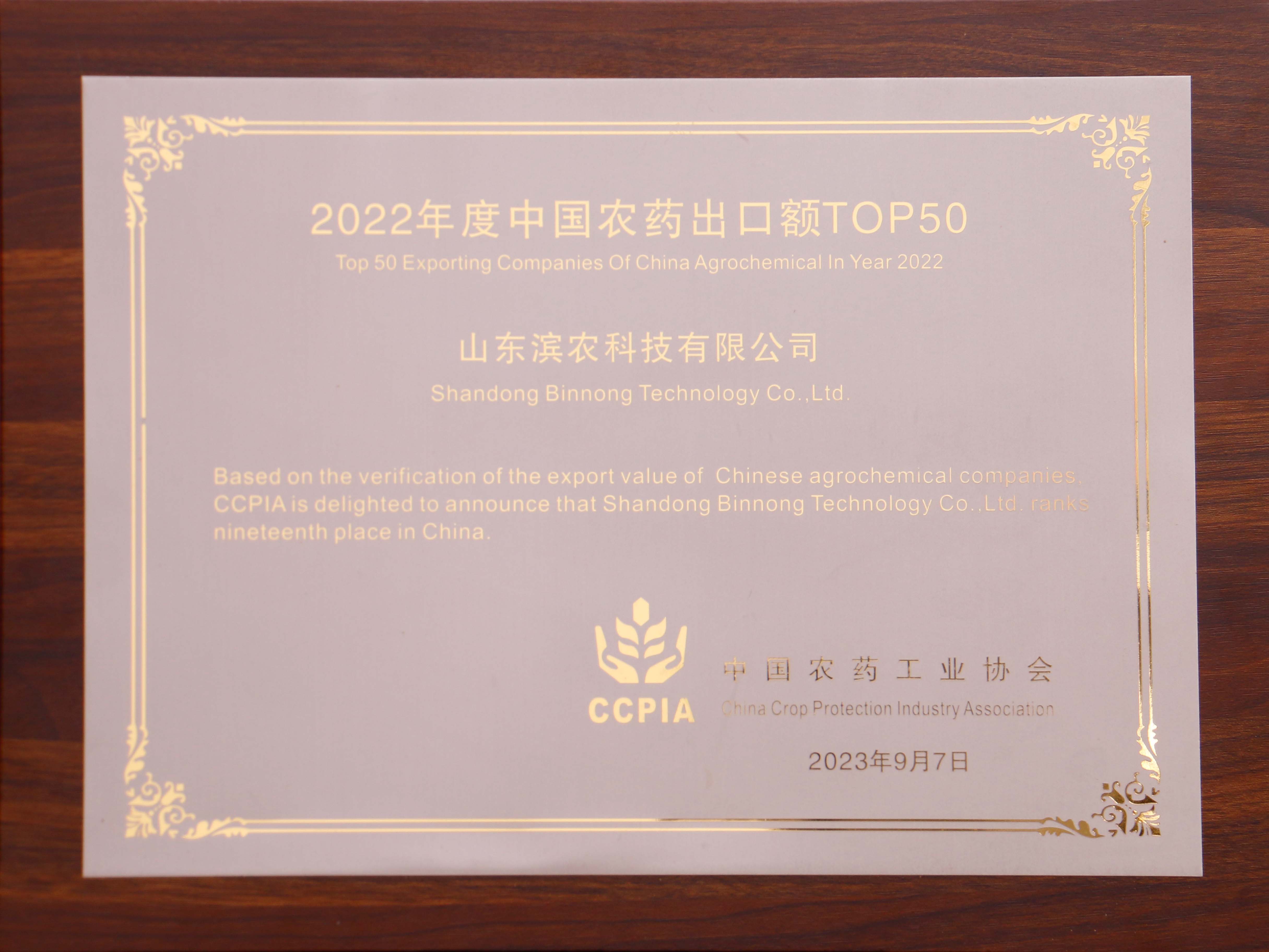 9月7日,在“第十屆中國植物保護(hù)產(chǎn)品國際貿(mào)易發(fā)展論壇”上,中國農(nóng)藥工業(yè)協(xié)會(huì)國際貿(mào)易委員會(huì)發(fā)布了2022年度“中國農(nóng)藥出口額Top 50”。濱農(nóng)科技榮獲2022年度“中國農(nóng)藥出口額Top 50”第十九名。
