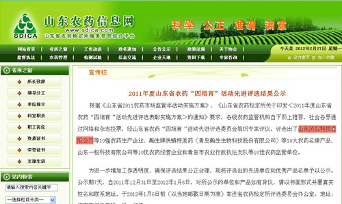 2012年1月6日,山東省農(nóng)藥檢定所主辦的2011年度山東省農(nóng)藥“四培育”活動(dòng)先進(jìn)單位和優(yōu)秀產(chǎn)品評(píng)選結(jié)果出爐:濱農(nóng)科技獲得十強(qiáng)農(nóng)藥生產(chǎn)企業(yè)第一名的榮譽(yù)稱號(hào)。這是我公司繼2010年度獲得第一名之后再次蟬聯(lián)這一稱號(hào)。